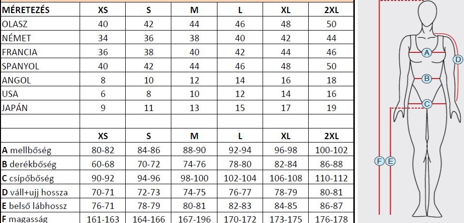 Mi a termékeinken az olasz skála szerinti méreteket adtuk meg. Tettük ezt azért, mert ez alapján egyszerű a legfontosabb méret, a mellbőség meghatározása. Ez a méret duplája.
